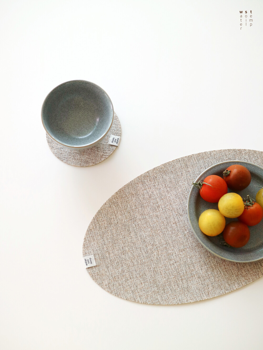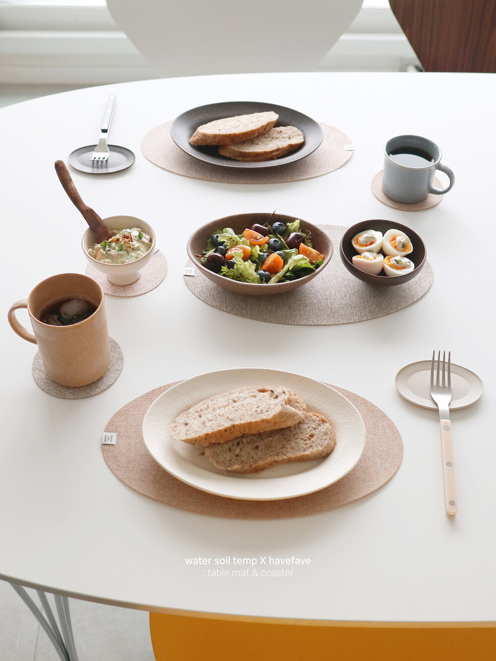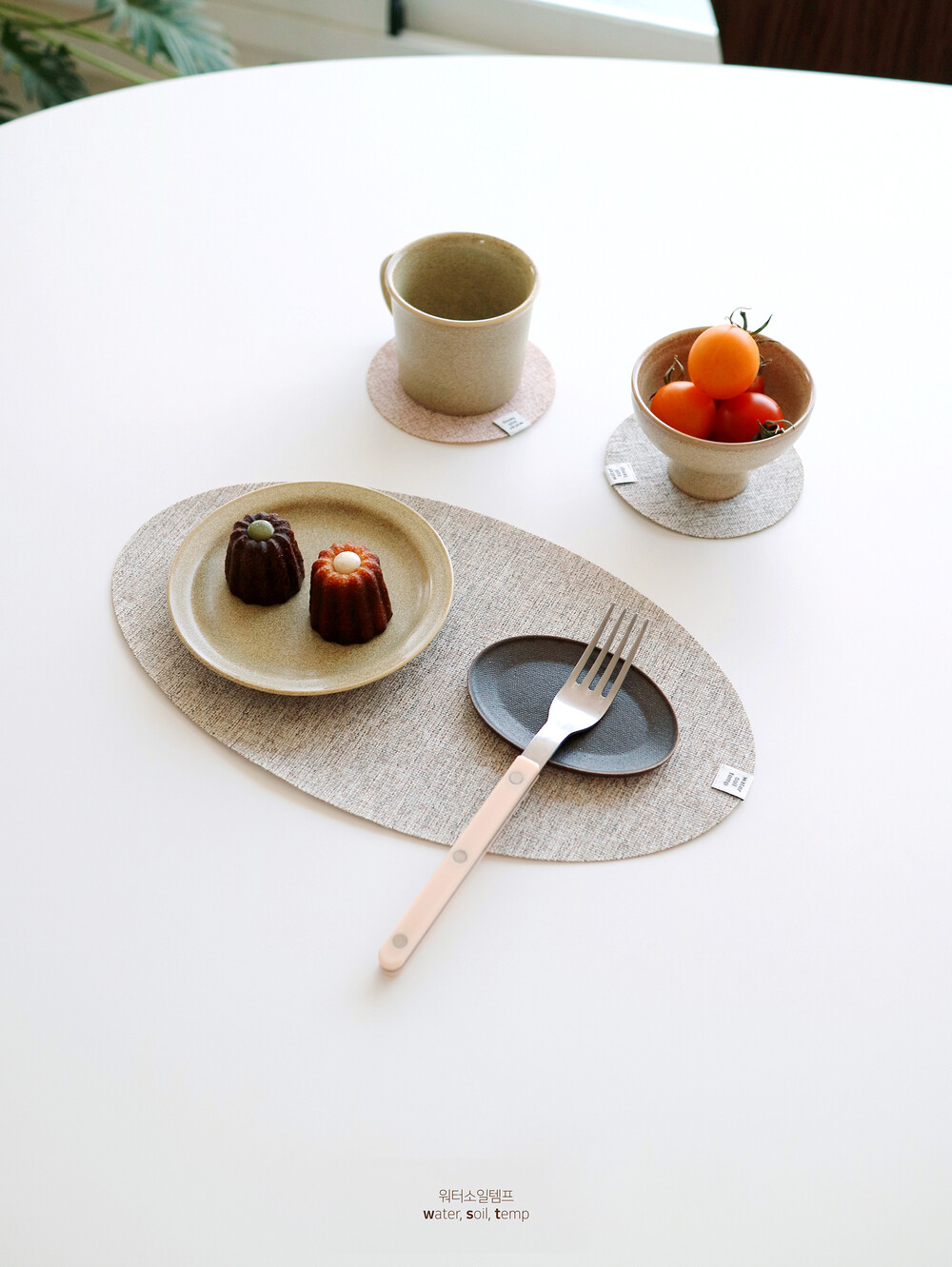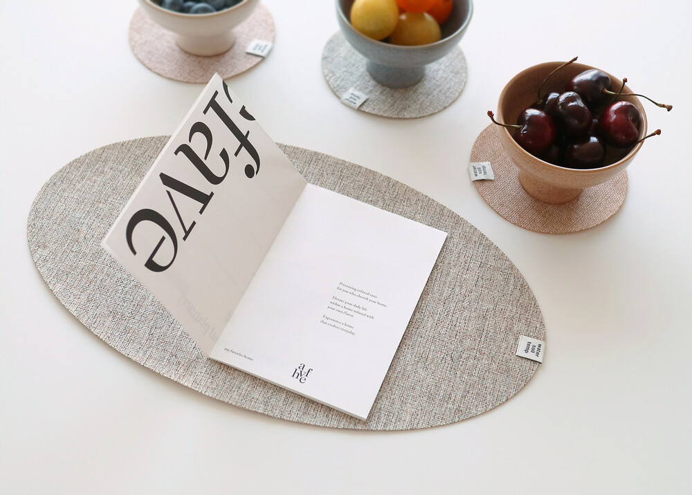 워소템의 테이블 웨어를 돋보이게 만들어줄 타원 디자인의 매트와 동그란 모양의 코스터가