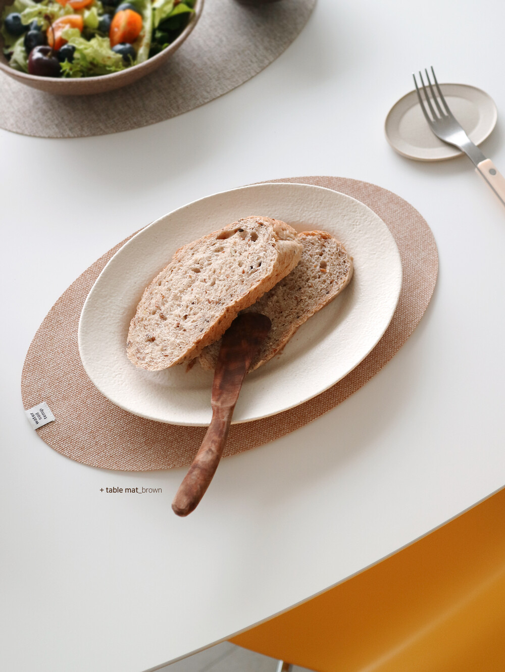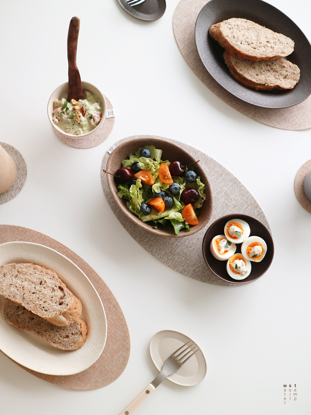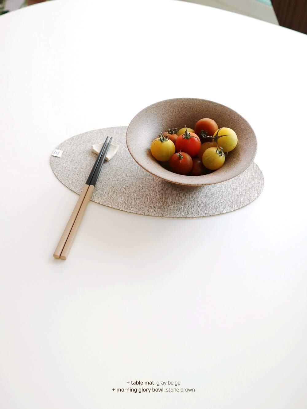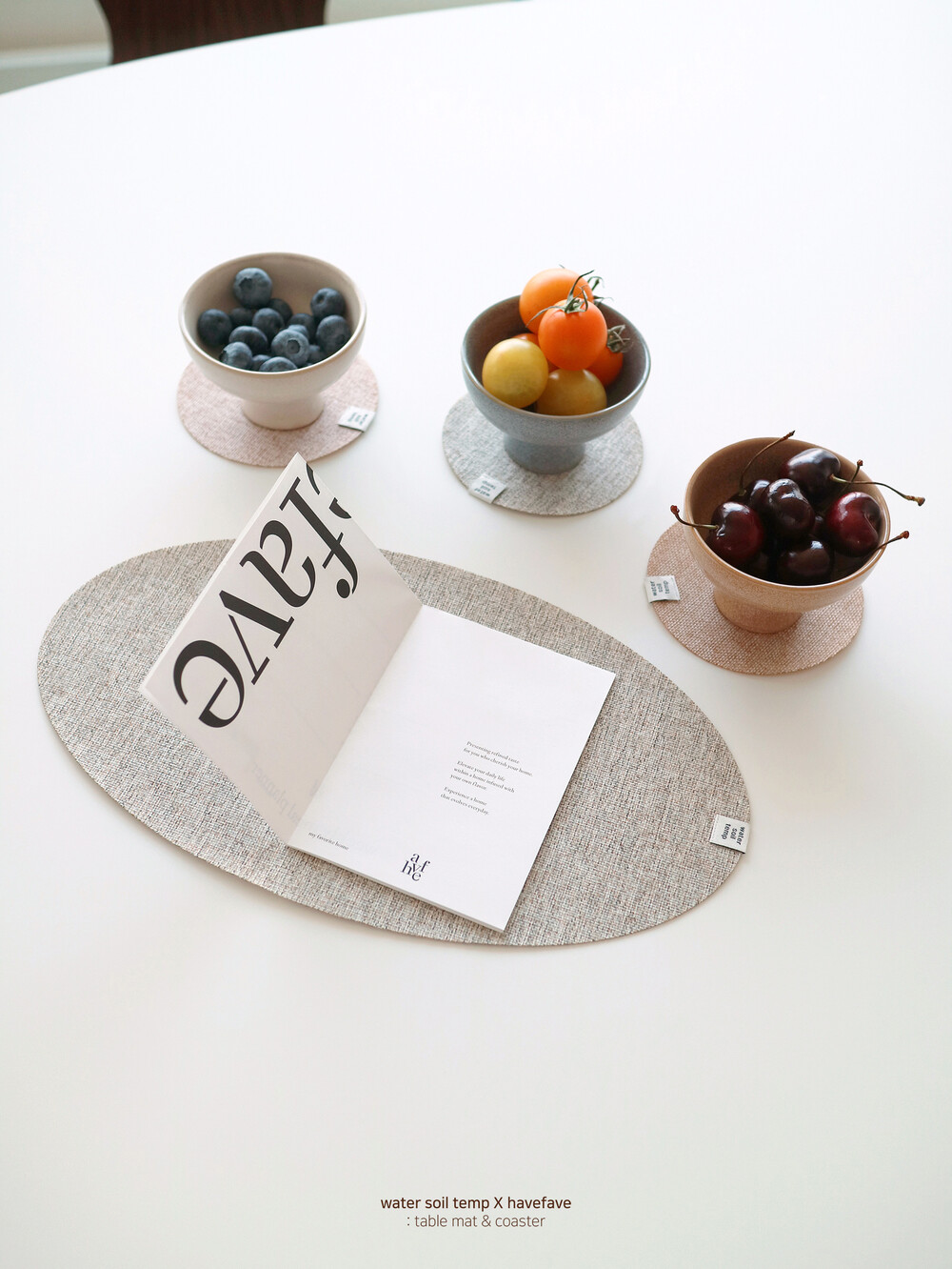워소템의 테이블 웨어를 돋보이게 만들어줄 타원 디자인의 매트와 동그란 모양의 코스터가